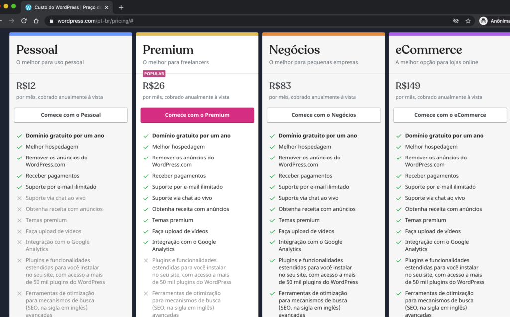 Caso não queria começar com planos gratuitos, esses são os Planos WordPress.com em abril/2021 (caros!).