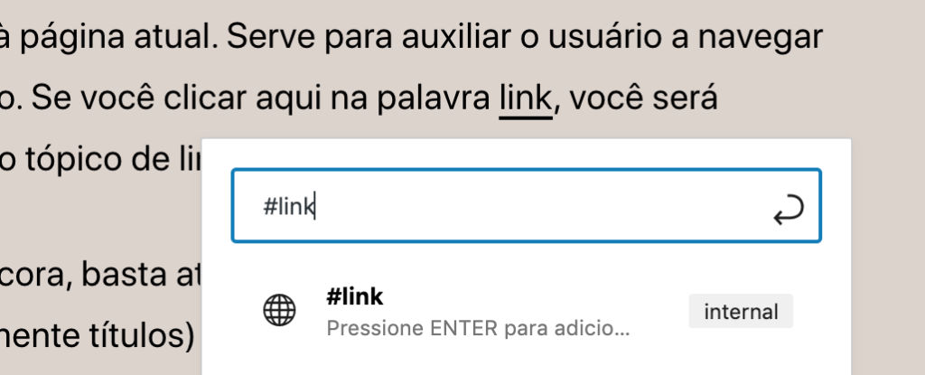 É um link interno à página atual. Serve para auxiliar o usuário a navegar pelo seu conteúdo. Se você clicar aqui na palavra link, você será direcionado para o tópico de links, logo acima.